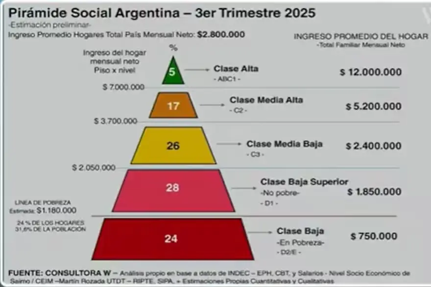 En medio de un año marcado por bruscos ajustes económicos y cambios en los patrones de consumo, la consultora W -dirigida por Guillermo Oliveto- difundió su nueva radiografía social correspondiente al tercer trimestre, que muestra una leve recomposición en la base de la pirámide y una caída en la proporción de hogares bajo la línea de pobreza. Ese es, según el informe, el principal contraste respecto del segundo trimestre.