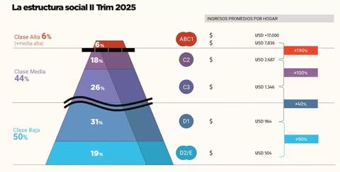 Más abajo se sitúa la "Clase media baja", cuyo umbral de ingreso arranca en $2,05 millones y registra un promedio de $2,4 millones. Este grupo abarca al 26% de los hogares.
