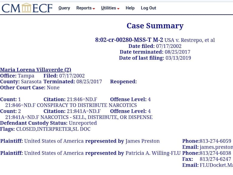 : distribución de drogas y conspiración para distribuir narcóticos, delitos con penas máximas de 20 años. La jueza Mary Scriven fijó una fianza de US$50.000, y Villaverde se declaró no culpable. El juicio fue programado para septiembre, pero el proceso se fue modificando.