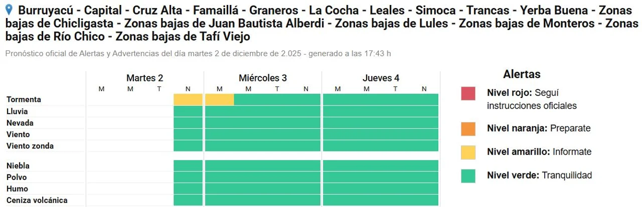 El Servicio Meteorológico Nacional emitió una alerta por tormentas fuertes que comenzará a regir este martes por la noche y se extenderá hasta la madrugada del miércoles. El organismo advierte que el área puede ser afectada por tormentas aisladas de variada intensidad, algunas potencialmente fuertes o severas, con condiciones peligrosas para la población.
