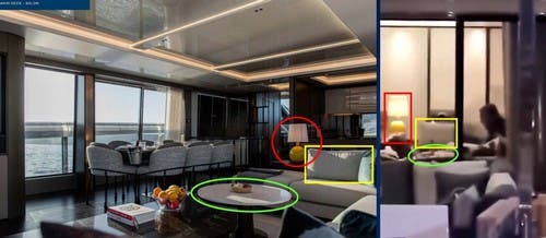 El Chiqui Tapia en el yate según el video (izq.) y la foto de la embarcación que se ofrece en alquiler. La lámpara y la mesa son las mismas.