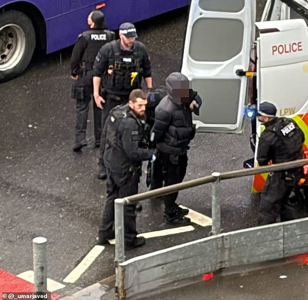 DETENCION. La Policía británica apresa a uno de los sospechosos tras el enorme despliegue que demandó el incidente generado en horas de la mañana del domingo en el aeropuerto británico.
