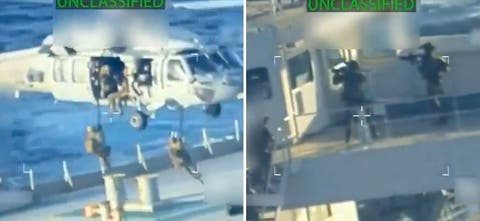 Además, se ve a soldados que suben escaleras e ingresan en el interior del buque. El video se complementa con imágenes aéreas tomadas desde helicópteros en la zona.