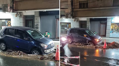 En las fotos enviadas se observa al vehículo detenido con su parte delantera hundida en el pozo, mientras alrededor se aprecia agua en la calzada, material removido y señalización colocada en el lugar. A pesar de ello, el conductor aparentemente no habría sufrido lesiones, aunque el auto quedó atrapado y a la espera de asistencia.