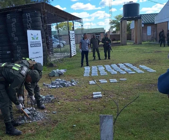 A los pocos minutos llegaron al lugar efectivos, de Gendarmería Nacional, quienes terminaron haciéndose cargo del procedimiento.La sorpresa para los efectivos llegó al inspeccionar la carga que transportaba el hombre. Entre los objetos hallados se encontraba un banco de cemento de tipo jardín, que se había roto por los bruscos movimientos del vehículo, dejando ver un envoltorio de nylon transparente. Tras la revisión, se confirmó que se trataba de cocaína.