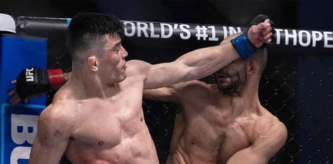 el "Chino" ejecutó a la perfección un "spinning backfist" que tumbó a su rival, lo que aprovechó para lanzarse al suelo y rematar con varios codazos consecutivos, que obligaron a la intervención del árbitro cuando iban 1:29 del segundo asalto.