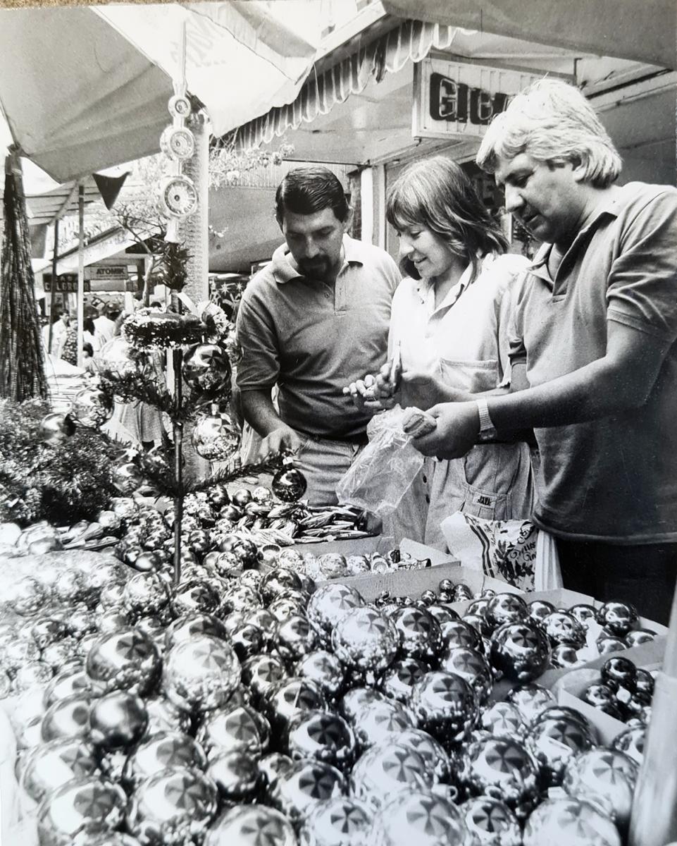 Finalmente, varias imágenes registran la venta de juguetes en puestos callejeros durante las décadas del ’50 y del ’80. Veredas, plazas y zonas céntricas se llenaban de vendedores, familias y niños eligiendo regalos en los días previos a la Navidad, en un clima marcado por la cercanía, la austeridad y el contacto directo entre comerciantes y compradores.