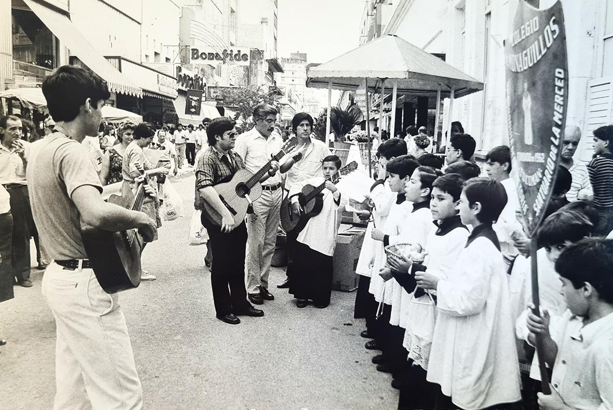 Las imágenes también retratan a niños y monaguillos recorriendo el centro de la ciudad, cantando villancicos y participando de actividades religiosas vinculadas a la Navidad. Estas escenas reflejan una época en la que las celebraciones se vivían intensamente en el espacio público, con fuerte presencia de la Iglesia y de las instituciones educativas.