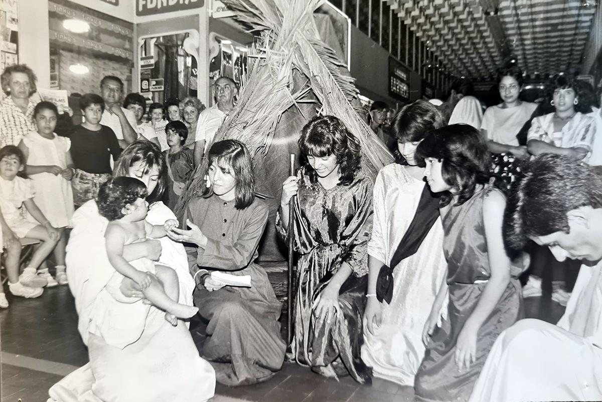 Otras fotografías muestran pesebres armados en escuelas, galerías y espacios públicos, una costumbre extendida que involucraba a alumnos, docentes y comunidades enteras. La representación del nacimiento de Jesús ocupaba un lugar central en la celebración, con estructuras armadas de manera artesanal y abiertas a la visita de los vecinos.