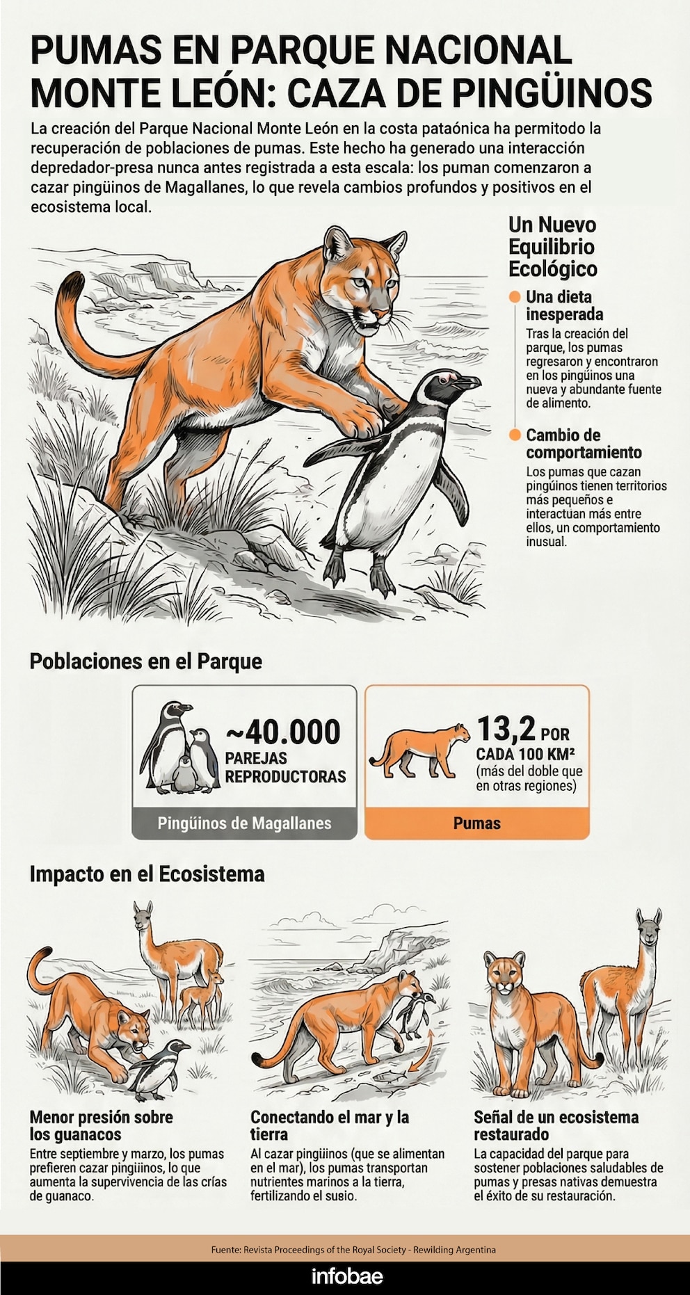 Un estudio científico indicó que la creación de un parque nacional en la costa patagónica permitió la recuperación simultánea de grandes carnívoros y aves marinas, generando un singular caso de coevolución depredador-presaLos pumas del Parque Nacional Monte León, en la costa atlántica de Santa Cruz, incorporaron de forma sistemática a los pingüinos de Magallanes en su dieta, un comportamiento inédito en la región que está transformando la dinámica ecológica local. El fenómeno fue documentado por un estudio publicado en la revista Proceedings of the Royal Society y se vincula directamente con procesos de restauración ambiental y cambios históricos en el uso del territorio.