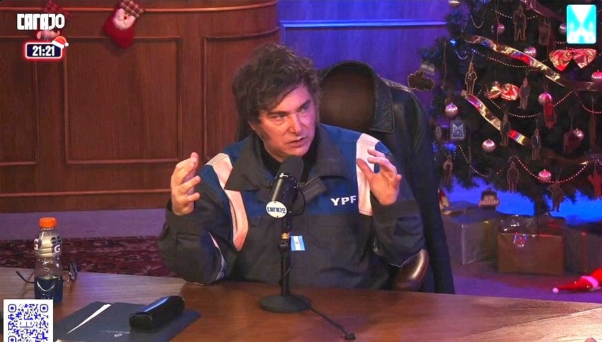La visita del presidente coincidía esta noche con el tratamiento en la Cámara de Diputados del proyecto de ley de Presupuesto 2026. El presidente visitó el canal de streaming vestido una vez más con el mameluco de YPF.