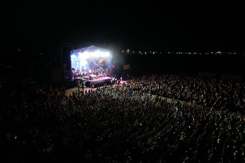 El recital comenzó pasadas las 21, un día antes de lo previsto, y colmó el predio ubicado sobre el boulevard San Luis y camino de sirga. Cerca de 2.000 sillas fueron ocupadas, mientras que cientos de asistentes eligieron seguir el concierto sentados en el piso. La entrada fue libre, con la consigna de colaborar con alimentos no perecederos, destinados a Cáritas y a la Fundación León.