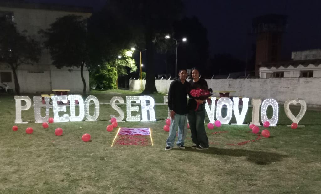 Desde temprano, bajo el sol intenso que todavía caía sobre el barrio Roca, Gabriel trabajó con paciencia junto a la familia de Nadia para preparar el lugar. Cada elemento fue pensado con cuidado: sobre el césped acomodaron grandes letras luminosas que, al encenderse, formarían una pregunta tan simple como contundente: “¿Puedo ser tu novio?”.