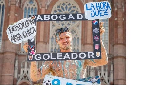 “Abogado y goleador”, reza el cartel de recibida del futbolista que sonrió ante la cámara y combinó sus dos pasiones para darle un tono humorístico.