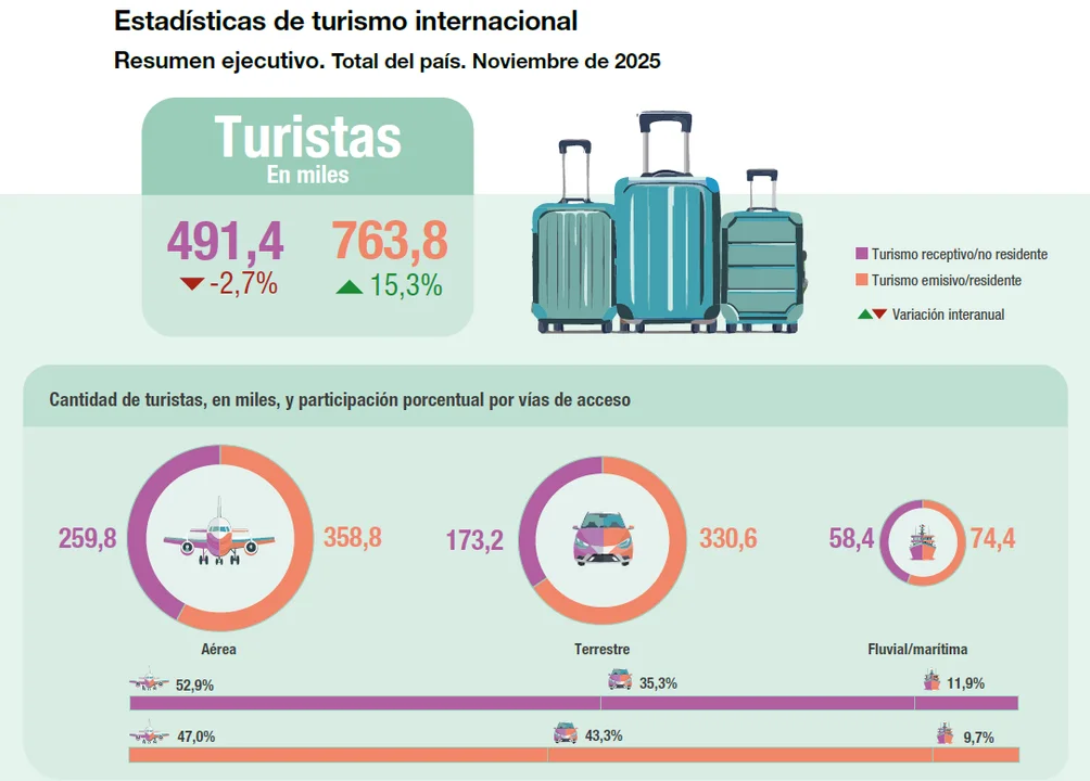 La cantidad de turistas que llegaron del exterior bajó 2,7% en noviembre, mientras que los que salieron subieron 15,3%, lo que arrojó un déficit de 224 mil turistas, que engrosó la salida de divisas.