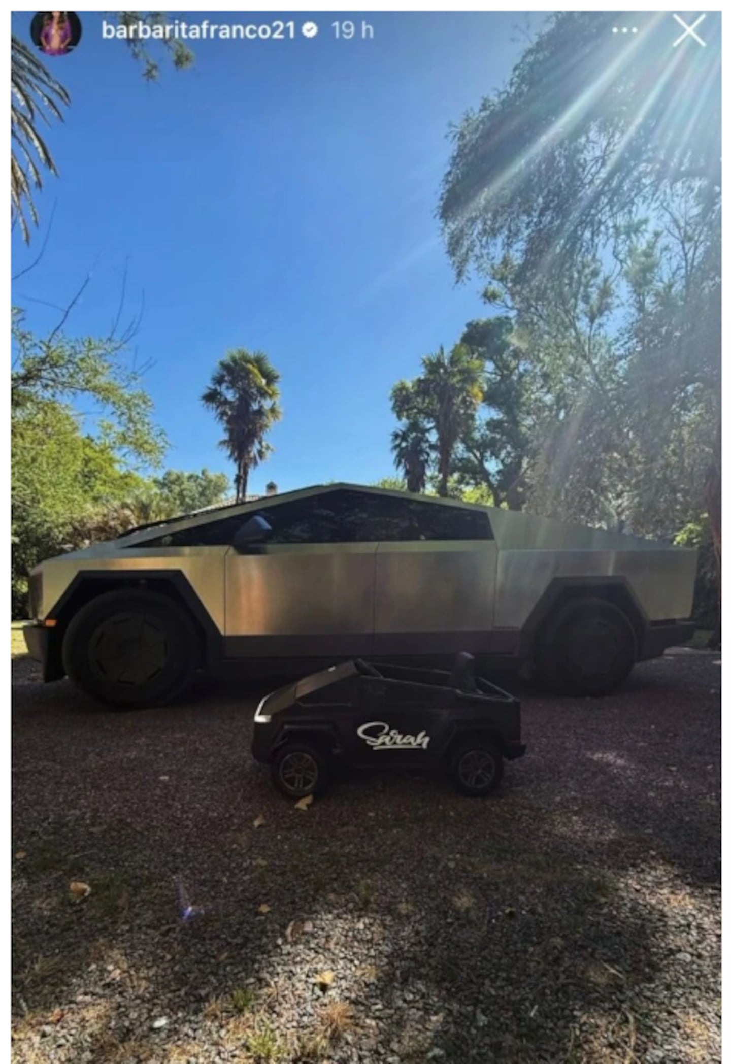 La sorpresa no terminó ahí. Barby mostró que su hija Sarah, fruto de su relación con Burlando, también recibió su propio regalo: una mini Cybertruck a batería, pensada especialmente para niños. Así, madre e hija ahora comparten el mismo modelo de auto, cada una en su versión.
