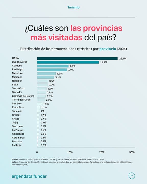 El turismo en Argentina se encuentra concentrado en unas pocas localidades, en un contexto adverso para el sector debido al encarecimiento en dólares que tuvo el país desde que Javier Milei es presidente. Aun así, los datos oficiales muestran algunas sorpresas en el peso de algunas provincias que no suelen estar en el radar a la hora de repasar los destinos más solicitados.Un informe de Fundar, realizado en base a datos del INDEC y la Secretaría de Turismo, remarcó que entre la ciudad y la provincia de Buenos Aires, Córdoba y Río Negro concentran más del 60% de las pernoctaciones, tanto de argentinos como de extranjeros. Dentro de estas provincias, el trabajo destacó a los balnearios de la Costa Atlántica, a las sierras y la capital cordobesa y a Bariloche como los lugares más visitados.