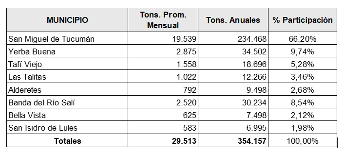 El principal aporte proviene de San Miguel de Tucumán, que con 19.539 toneladas por mes y 234.468 al año concentra el 66,20 % del total de los residuos del consorcio. La capital provincial, por su densidad poblacional y actividad económica, se ubica muy por encima del resto de los municipios. Sólo en esta ciudad residen 590.000 personas, según el censo 2022.
