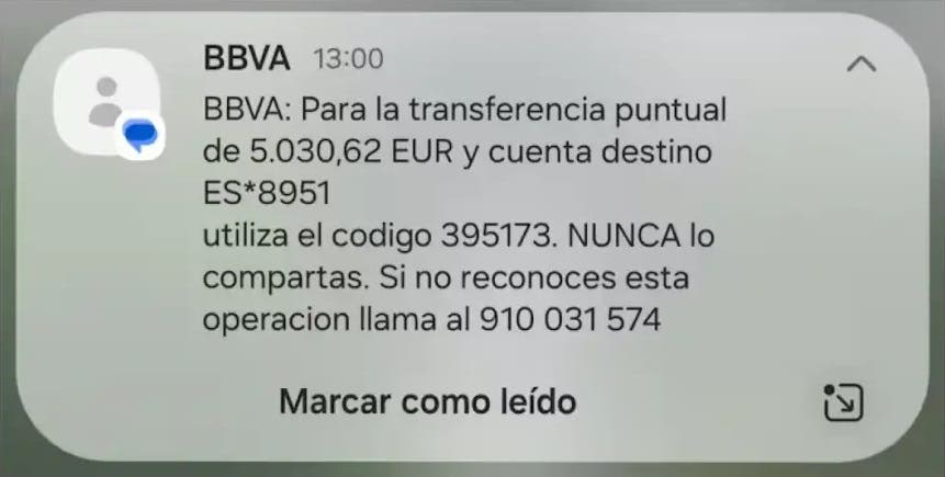 Aperador resaltó que esta estafa es inquietante ya que su nivel de credibilidad es elevado. El mensaje, que llega a nombre de la entidad financiera BBVA, aparece bajo el mismo remitente que el resto de los comunicados oficiales del banco. Es decir, el texto pertenece al mismo hilo de mensajes que los que recibe el cliente luego de realizar transacciones y transferencias legítimas.