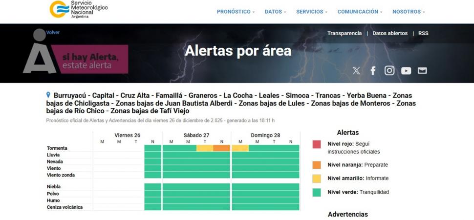 El Servicio Meteorológico emitió un alerta por tormentas de nivel amarillo para la tarde y naranja para la noche de este sábado 27 de diciembre, que abarca a amplias zonas del territorio tucumano, con posibilidad de lluvias intensas, ráfagas fuertes, granizo y actividad eléctrica.Según el pronóstico oficial de Alertas y Advertencias, generado a las 18:11, las áreas alcanzadas incluyen Burruyacú, Capital, Cruz Alta, Famaillá, Graneros, La Cocha, Leales, Simoca, Trancas, Yerba Buena y las zonas bajas de Chicligasta, Juan Bautista Alberdi, Lules, Monteros, Río Chico y Tafí Viejo.