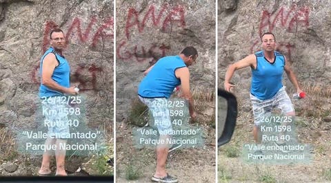 Las imágenes, que se viralizaron en redes sociales, muestran al individuo frente a la pared de piedra recientemente pintada, en actitud desafiante, mientras advierte que podría arrojar una piedra contra quien registraba la escena. El hecho ocurrió en un sector del río Limay, dentro de un área natural protegida, donde este tipo de prácticas están expresamente prohibidas.
