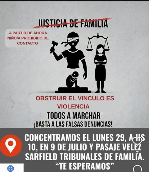 Organizaciones y familias autoconvocadas realizarán este lunes 29, a las 10, una concentración frente a los Tribunales de Familia, en la zona de 9 de Julio y pasaje Vélez Sarsfield, en Plaza Yrigoyen (Congreso y General Paz), con el objetivo de visibilizar distintas problemáticas vinculadas a los procesos judiciales familiares.