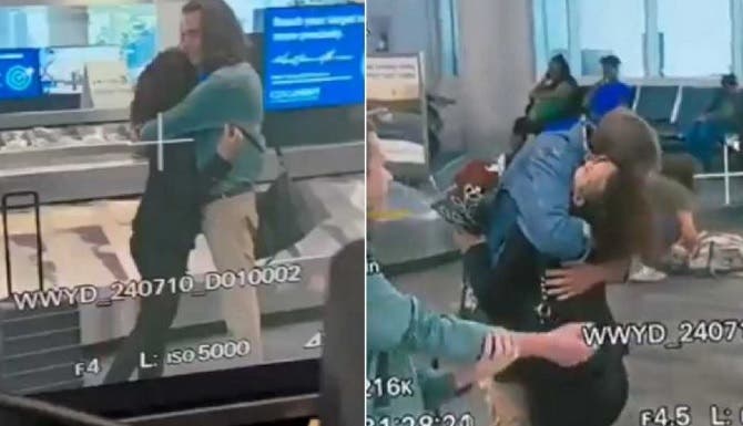 Al notar su llegada, la mujer se separa rápidamente del primer acompañante y adopta una actitud tranquila mientras agarra su equipaje. Segundos después, la filmación muestra que presenta a ambos hombres entre sí, ante la mirada atónita de quienes se encontraban en el lugar.
