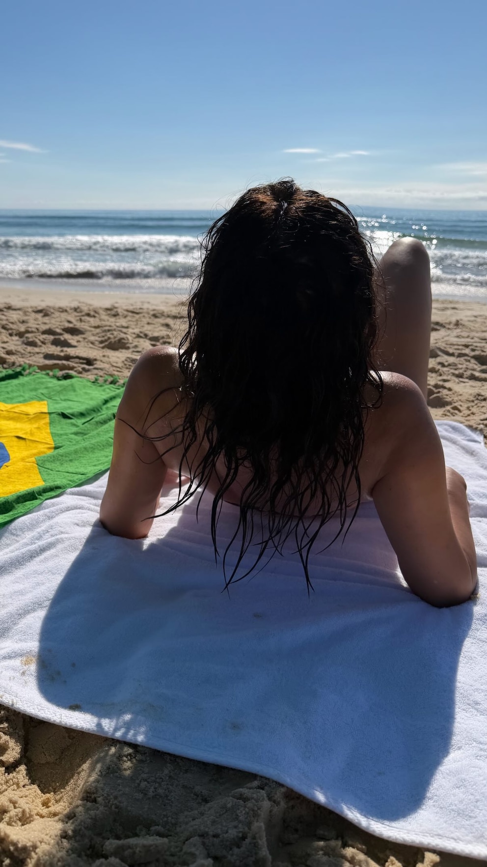 En la primera imagen, Griselda está recostada boca arriba sobre una toalla blanca, mirando hacia el mar con el cabello suelto y húmedo. A su lado, se distingue una toalla verde con detalles amarillos y azules, y el horizonte revela el océano bajo un cielo despejado, mientras la luz solar destaca el contorno de su figura.