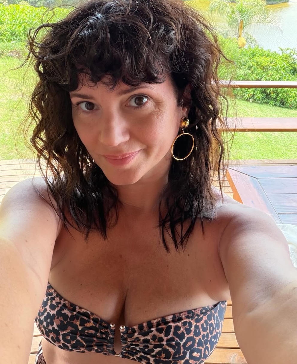 En otra postal, Griselda se muestra de pie con un top bandeau animal print y un short deportivo marrón con tiras blancas, el cabello mojado y los brazos en movimiento, con el mar y la vegetación en el fondo. También se la ve en un primer plano desenfocado, riendo y acercando la mano a la cámara, con grandes aros dorados, parte de un entorno de madera y cielo claro de fondo. Un selfie la retrata con expresión distendida, el cabello rizado y húmedo, los mismos aros y un fondo de césped verde y madera, bajo luz natural.