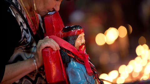 Las banderas rojas desplegadas al viento tornan inocultables los sitios de veneración, donde los devotos encienden velas rojas y dejan toda clase de objetos para cumplir la promesa por los favores sobrenaturales recibidos.