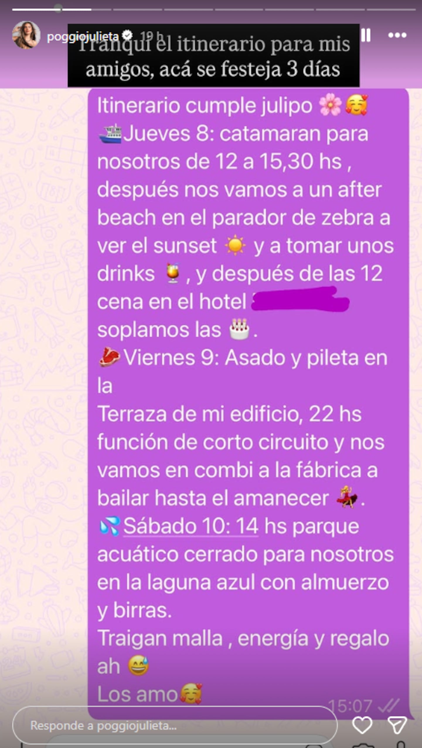 Juli Poggio mostró el itinerario para su cumpleaños en Carlos Paz: el festejo durará tres días | Créditos: Instagram @poggiojulieta