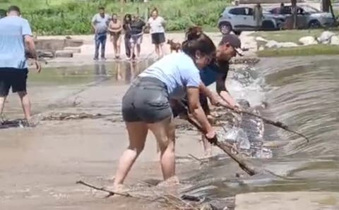 En registros fílmicos y videos que circularon en las últimas horas, se observa a un grupo de mujeres retirando ramas, troncos y residuos que habían quedado atascados en las alcantarillas y badenes como consecuencia de la crecida.