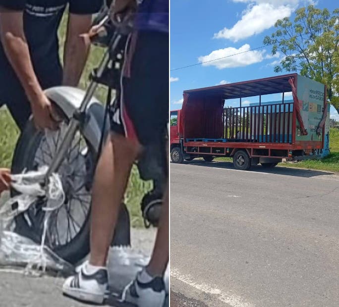 Un motociclista sufrió un insólito accidente vial luego de que un plástico se desprendiera de un camión repartidor de gaseosas y se enredara en la rueda delantera de la moto en la que circulaba, provocando su caída sobre la calzada.