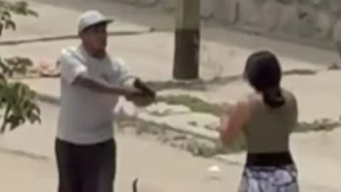 Ya reincorporado, el sujeto retomó los insultos y avanzó nuevamente sobre la pareja. Tal como se observa en el material audiovisual, en ese momento extrajo un arma que llevaba consigo y la exhibió de manera intimidante, primero a la mujer y luego a su acompañante, generando una escena de extrema tensión en plena calle y a la vista de transeúntes.
