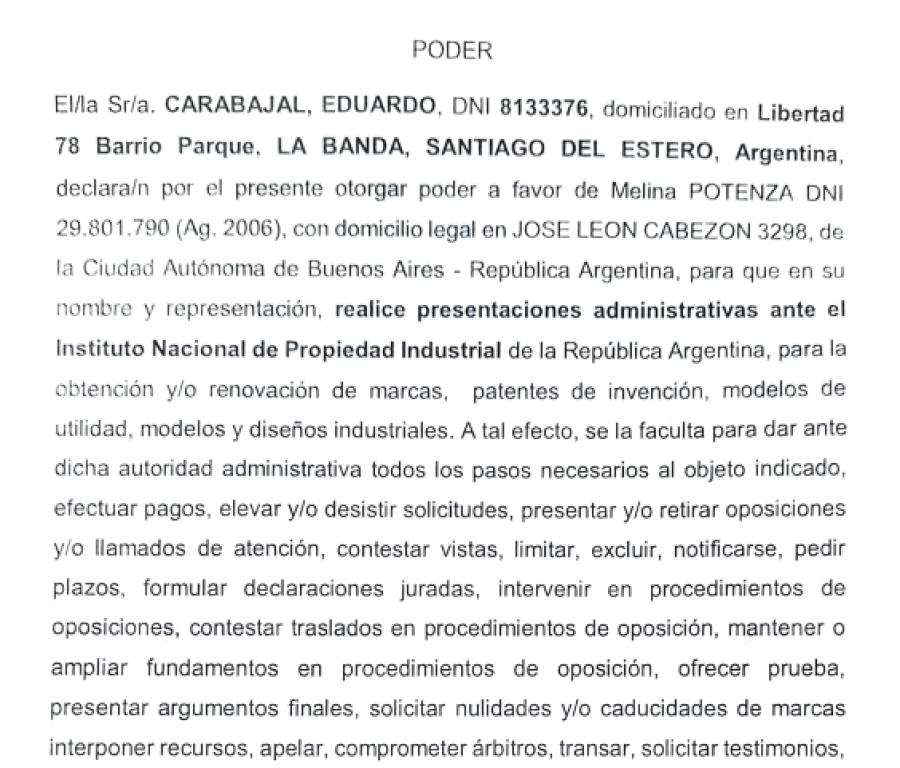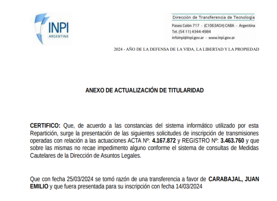 El giro llega en 2024: existe un contrato de cesión por el cual Eduardo Carabajal transfiere el 100% de la marca (Registro N° 3.463.760 / Acta 4.167.872) a favor de Juan Emilio Carabajal, declarando la cesión como gratuita y autorizando la inscripción del trámite. Y el INPI certifica la actualización de titularidad: con fecha 25/03/2024 “se tomó razón” de la transferencia a favor de CARABAJAL, JUAN EMILIO (presentada el 14/03/2024), quedando como titular vigente.