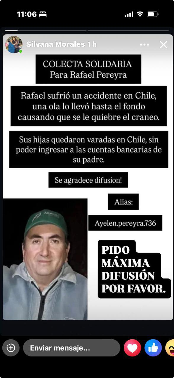 Rafael Pereira, oriundo de Alderetes, sufrió una fractura de cráneo tras ser arrastrado por el mar en una playa de Iquique y permanece en coma inducido; sus cuatro hijos quedaron varados en Chile.Una familia tucumana atraviesa horas críticas en Chile luego de que Rafael Pereira, oriundo de Alderetes, Tucumán, sufriera un grave accidente en el mar mientras se encontraba de vacaciones con sus hijos. El hombre permanece internado en terapia intensiva, entubado y en coma inducido, con pronóstico reservado, tras ser arrastrado por una fuerte corriente en una playa de Iquique.
