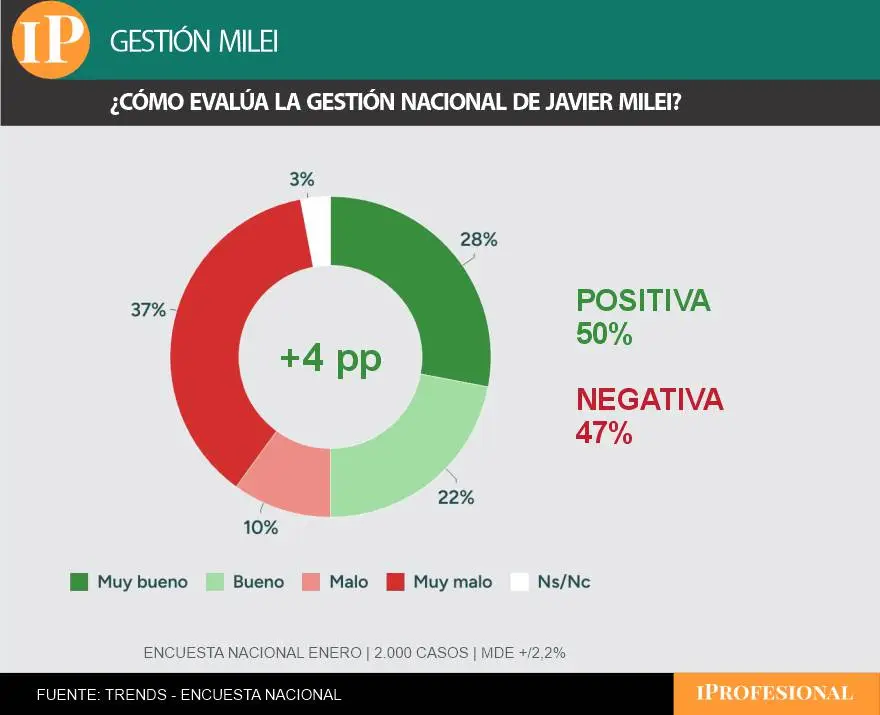 A ese clima se le suma que la evaluación positiva sobre el Gobierno fue del 50% mientras que el 47% la desaprobó. La polarización se ve claramente, pero la administración de Milei no la padece sino que por el contrario parece consolidarse en ella. Incluso el resultado fue casi idéntico cuando la encuesta preguntó "en qué dirección cree que va el Gobierno": para el 50% el rumbo es correcto y para el 46% incorrecto.