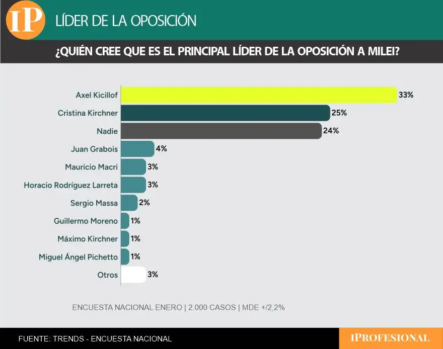 ante la pregunta sobre "quién es el líder de la oposición a Milei", Kicillof se destacó con el 33% y se impuso cómodo sobre Cristina Kirchner, que tuvo el 25%.De esta forma, la condena a prisión que cumple la expresidenta ya muestra su efecto inevitable en la arena política: empieza a quedar fuera de juego y Kicillof ocupa la centralidad desde su lugar de gobernador de la provincia más populosa del país, que hoy está enfrentado con La Cámpora de Máximo Kirchner.