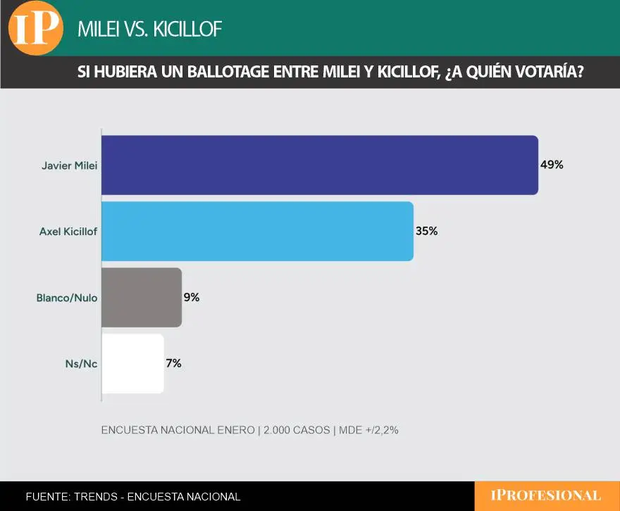 Igualmente la encuesta indagó: "Y si hubiera un balotaje entre Milei y Kicillof, ¿a quién votaría?". Aquí Milei obtuvo el 49% mientras que Kicillof consiguió apenas el 35%, lo que implica una victoria aplastante.
