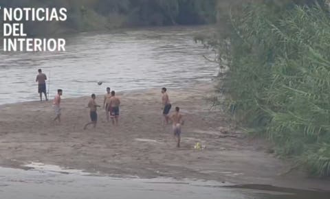 Con arcos fabricados a mano y una vieja y gastada pelota, armaron un picadito de fútbol sobre la arena que dejó la crecida.