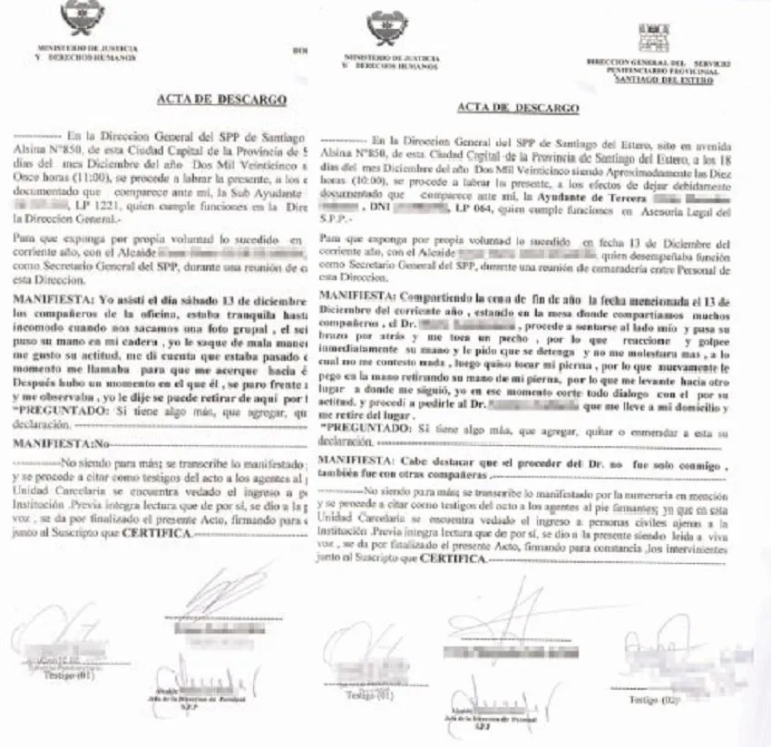 Seis empleadas administrativas del Servicio Penitenciario de Santiago del Estero, denunciaron a un funcionario de alto rango y abogado, atribuyéndole manoseos y todo tipo de excesos verbales, algunos de alto voltaje sexual, durante una cena de fin de año realizada en una finca de La Banda.Así se consigna en un sumario administrativo refrendado el 19 de diciembre pasado y en el que se relatan hechos sucedidos en una cena (noche del 13 y madrugada siguiente) con presencia de jefes y empleadas administrativas. El oficial acusado fue identificado como D.C.L.