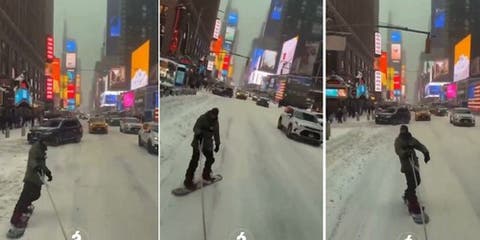 Este hombre se mostró andando en snowboard por una de las principales avenidas y lugares más icónicos de la ciudad que, ante estas condiciones, se mostró en los últimos días con menor cantidad de gente de lo habitual.
