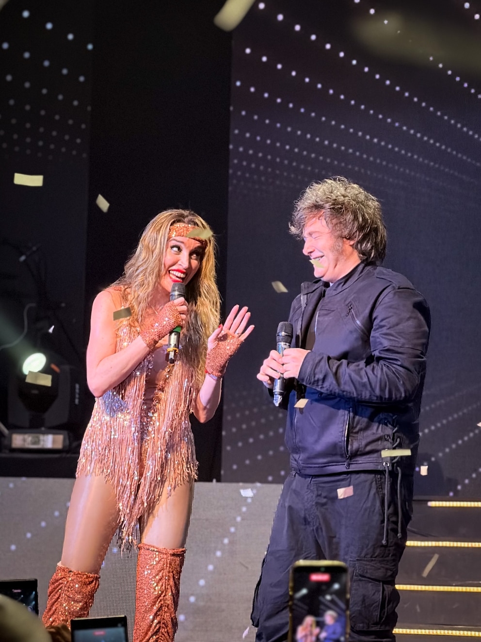 La aparición de Milei sobre el escenario despertó el entusiasmo de los presentes, quienes celebraron su participación y la interacción con la artista. No faltaron los gritos pidiendo para que vuelvan y hasta hubo un momento en el que se abrazaron y él le tomó la cintura.