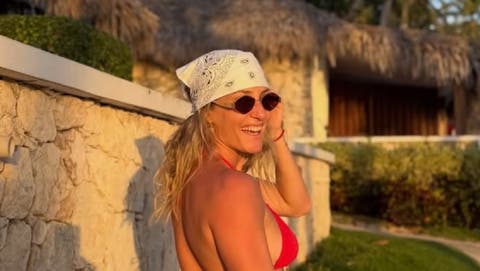 Más adelante, sorprendió con una de las bikinis más buscadas de la temporada: un modelo animal print de leopardo, con base en tono visón y manchas negras características del estampado. El diseño incluye adornos plateados en el frente y delicadas tiritas colgantes, y lo lució sin pañuelo, dejando el protagonismo al conjunto.